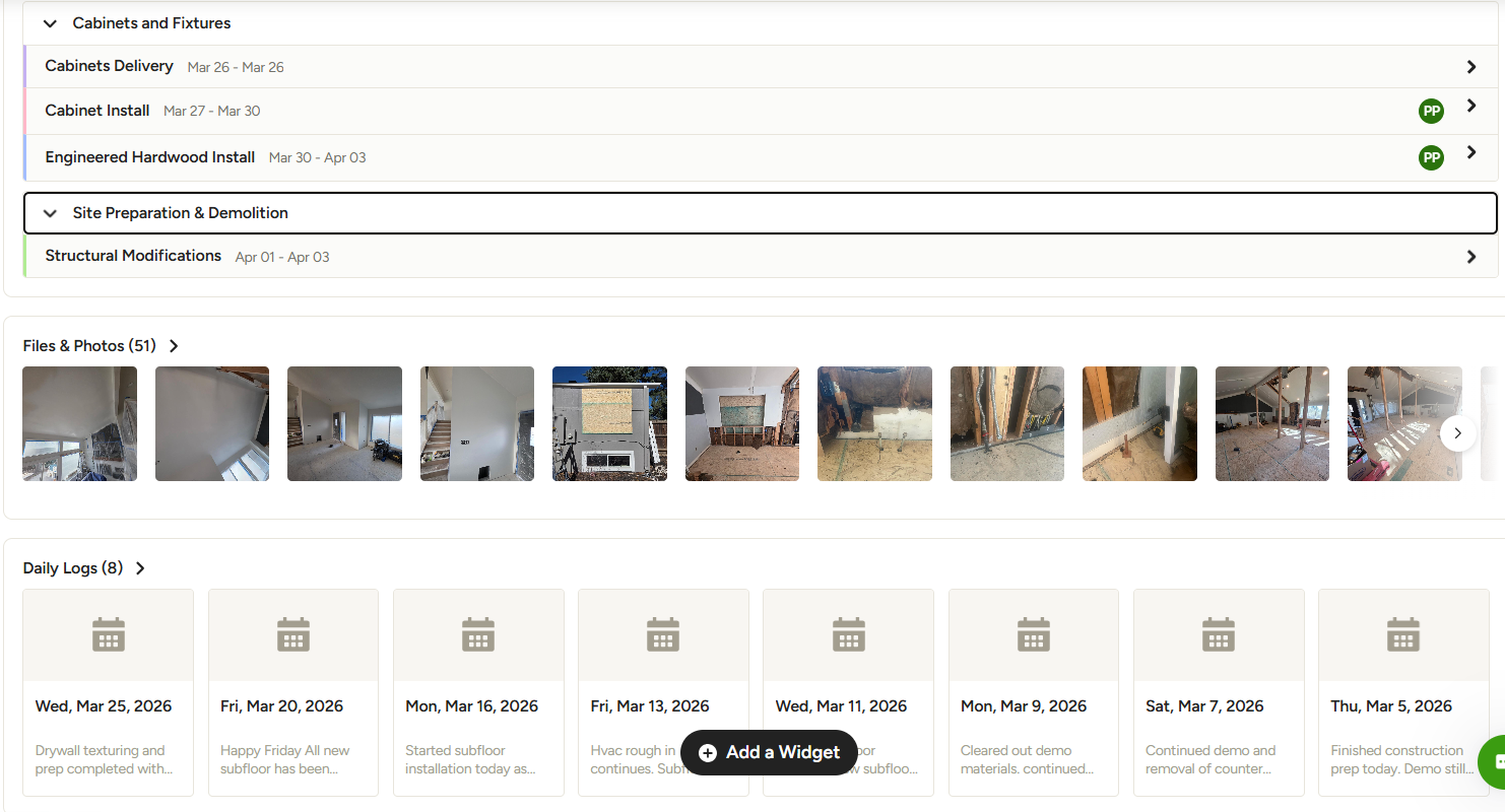 Daily logs, photos, messages, change orders.